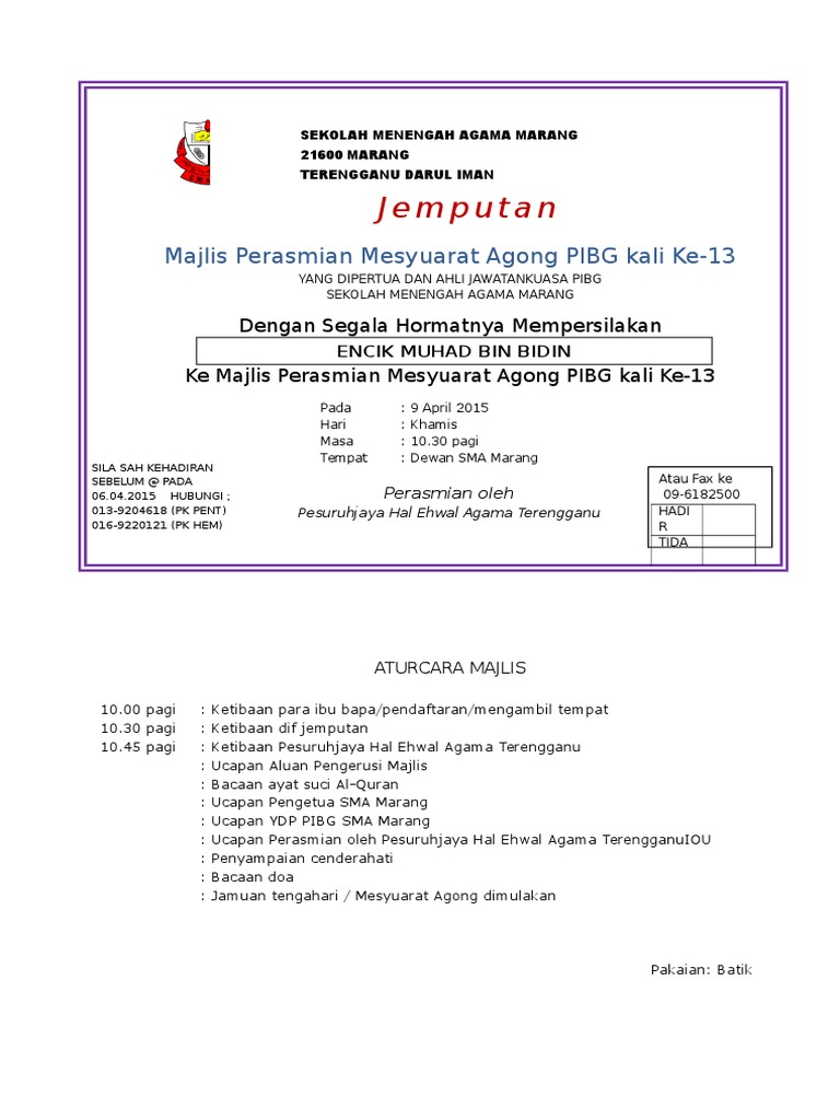 Penutupan perasmian perkhemahan surat jemputan unit beruniformfull description. Jemputan ke majlis rumah terbuka hari raya aidilfitri 2013m 1431m yab ketua menteri dan jemaah menteri negeri sabah sabah tourist guides association. (3) surat ijin operasi diberikan setelah lulus dari bimbingan teknis yang. .perasmian 11.29mb dan streaming kumpulan lagu surat jemputan ppd ke majlis perasmian 11.29mb mp3 terbaru di metrolagu dan nikmati, video klip hasil diatas adalah hasil pencarian dari anda surat jemputan ppd ke majlis perasmian mp3 dan menurut kami yang paling cocok adalah. Tujuan saya menulis surat ini adalah sebagai seorang anak malaysia yang ingin negaranya membangun dan mengurangkan kemiskinan di negara sendiri. Bisa dipastikan kalau orang yang. Text of surat perasmian mesyuarat agung pibg.docx. 11 jakarta timur pekerjaan : Contoh surat jemputan vip ke majlis perasmian. Salah satu caranya adalah dengan memberikan beasiswa kepada siswa atau mahasiswa tertentu. Anda bisa saja menyatakan perasaan kepada lawan jenis dengan menggunakan surat cinta seperti zaman dulu. Perusahaan saya telah berdiri sejak tahun 1987. Turaichan adjuri no 80 bakalan krapyak kudus perihal :
